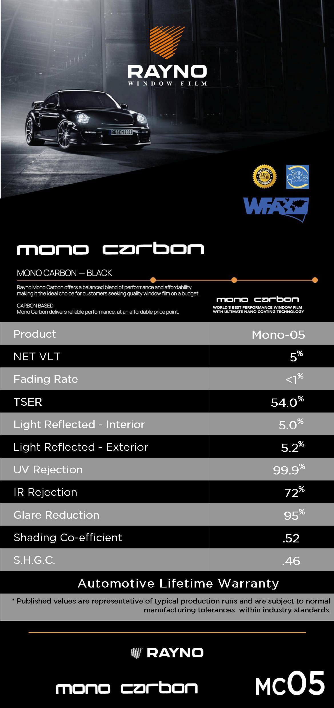 MonoCarbon 5% is a True Carbon based Automotive Window Film with Advanced Nano Carbon Technology to deliver a stable black colour that is resistant to fading.